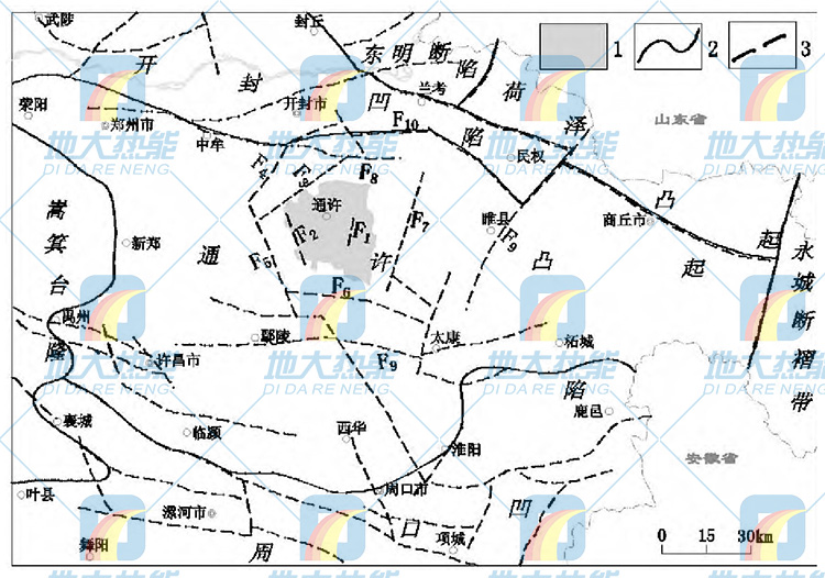 通許隆起大地構造屬巨型秦嶺緯向構造帶的東端和新華夏系第二沉積帶的復合部位, 屬嵩箕山脈的東延。北為開封凹陷及荷澤凸起, 南為周口凹陷, 西至嵩箕臺隆, 東鄰永城斷褶帶。隆起內EW、NE、NW向三組斷裂將基底切割成破碎的斷塊狀, 局部形成新生代小斷陷。通許縣由于處于隆起區中部 , 斷裂構造不發育, 對該區地熱形成有一定影響的斷層有四所樓-練成斷裂 (F1) 、豎崗斷裂 (F2) 、半坡—水坡斷裂 (F3) 、崔橋斷裂 (F6) 、杞縣斷裂 (F7) 、中牟—開封斷裂 (F10) 。