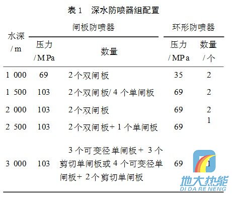 水下防噴器是海洋石油鉆采過程中用于防止井噴發(fā)生的專用設(shè)備,上部連接隔水管裝置,下部連接海底井口裝置。深水防噴器組通常有5個(gè)閘板和2個(gè)萬能防噴器組成,第5個(gè)閘板即底閘板可以剪斷套管,套管剪切閘板位于盲板的下部,以便在剪斷套管后可以關(guān)井,通常在套管可能遇卡或者鉆井裝置需要應(yīng)急脫離時(shí)會用到。2個(gè)萬能防噴器是冗余設(shè)計(jì)的需要,上部萬能防噴器作為井控的主要手段。根據(jù)水深的不同,深水防噴器組通常有不同的配置。表1是在總結(jié)Transocean公司所有不同水深典型鉆井船防噴器組配置情況得出的,可以作為深水鉆井防噴器組配置的參考。 對于浮式鉆井裝置(半潛式平臺或鉆井船),選用防噴器系統(tǒng)的通徑為?476.3mm(工作水深<600m)或?425.5mm(工作水深>600m),選用封井壓力為69、103、138MPa時(shí),視工作水深、海底至目的層深度和是否為特殊高壓的油氣層而定。為了適應(yīng)欠平衡鉆井的需要,井口防噴器組合要配置高壓旋轉(zhuǎn)防噴器,即隨鉆壓力控制系統(tǒng)PCWD(Pres2sureControlWhileDrilling)。