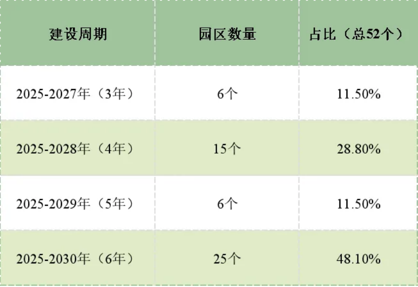 25個(gè)園區(qū)選擇6年建設(shè)周期(2025-2030年),占比接近50%。園區(qū)零碳轉(zhuǎn)型需要經(jīng)歷碳排放核算摸清底數(shù)、產(chǎn)業(yè)結(jié)構(gòu)優(yōu)化升級(jí)、清潔能源全面替代等全流程,尤其是石化、鋼鐵、有色金屬等傳統(tǒng)高耗能園區(qū),轉(zhuǎn)型難度大、涉及環(huán)節(jié)多,必須給予充足的時(shí)間窗口持續(xù)推進(jìn)。