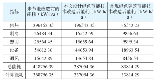 分別使用本文設計的被動式低能耗綠色建筑節能技術和基于專家評分的常規綠色節能技術改造,改造后能耗對比結果如表1所示。